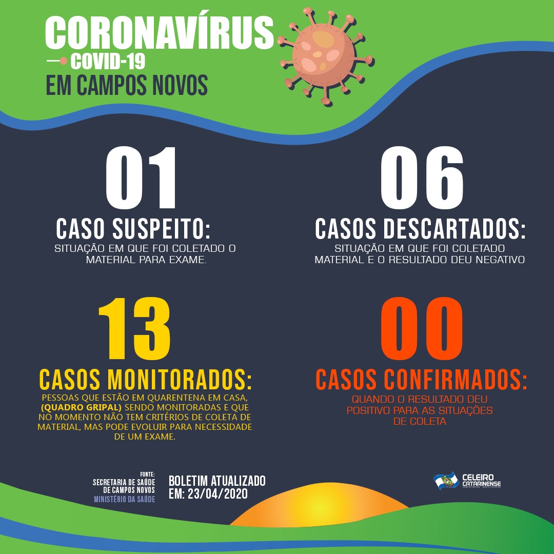 O Município de Campos Novos, por meio da Secretaria de Saúde, divulgou no fim da tarde desta quinta-feira, 23/04, o boletim local atualizado com informações sobre os casos do COVID 19, o novo Coronavírus.
