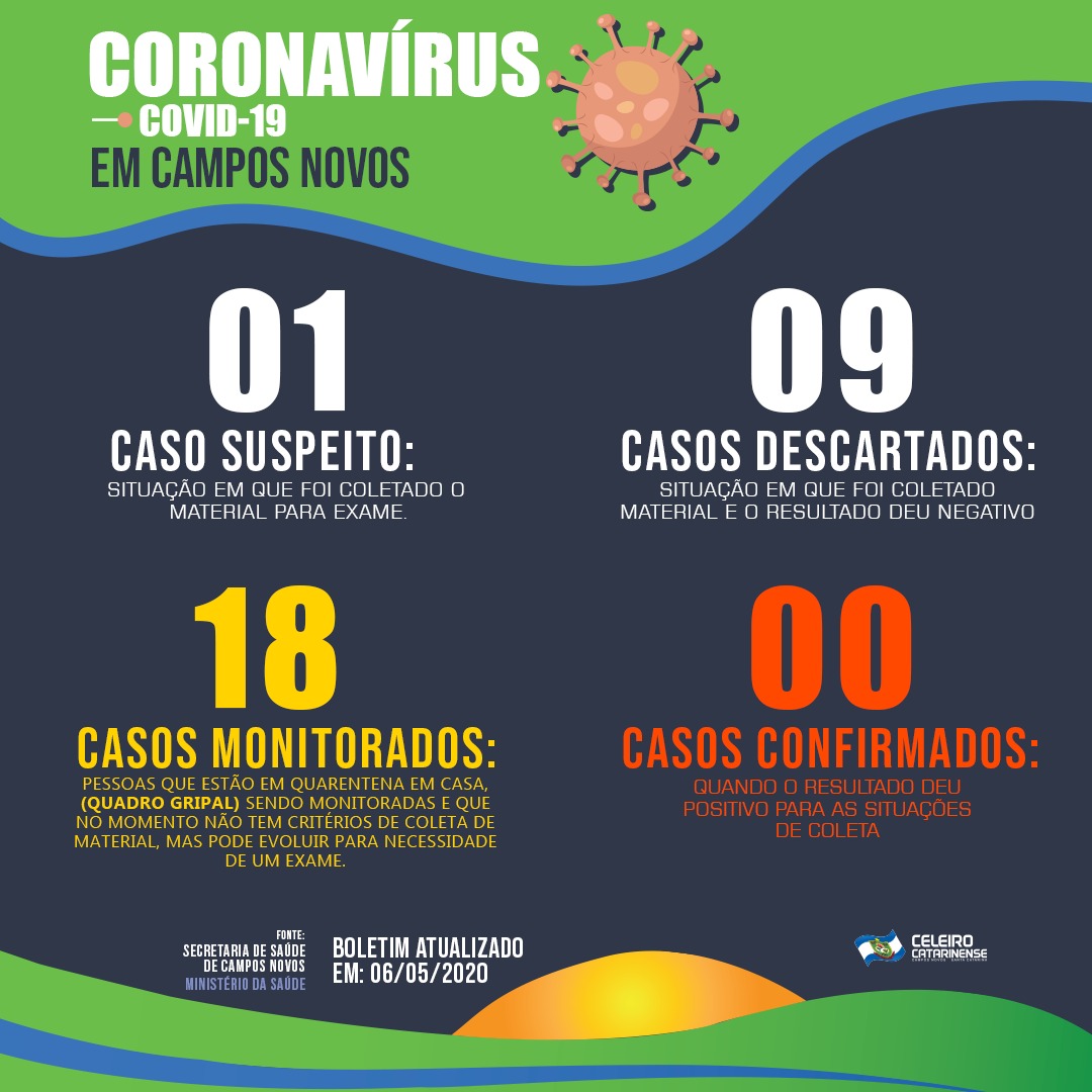Nesta quarta-feira, 06/05, uma paciente de 75 anos foi submetida a coleta de material para teste do Covid-19. A idosa apresentava dispneia (falta de ar) e os exames de imagem sugeriram que fosse realizado o exame. Com este registro, de acordo com a Secretaria Municipal de Saúde, o município conta com 01 Suspeito, 09 descartados e 18 casos em monitoramento.