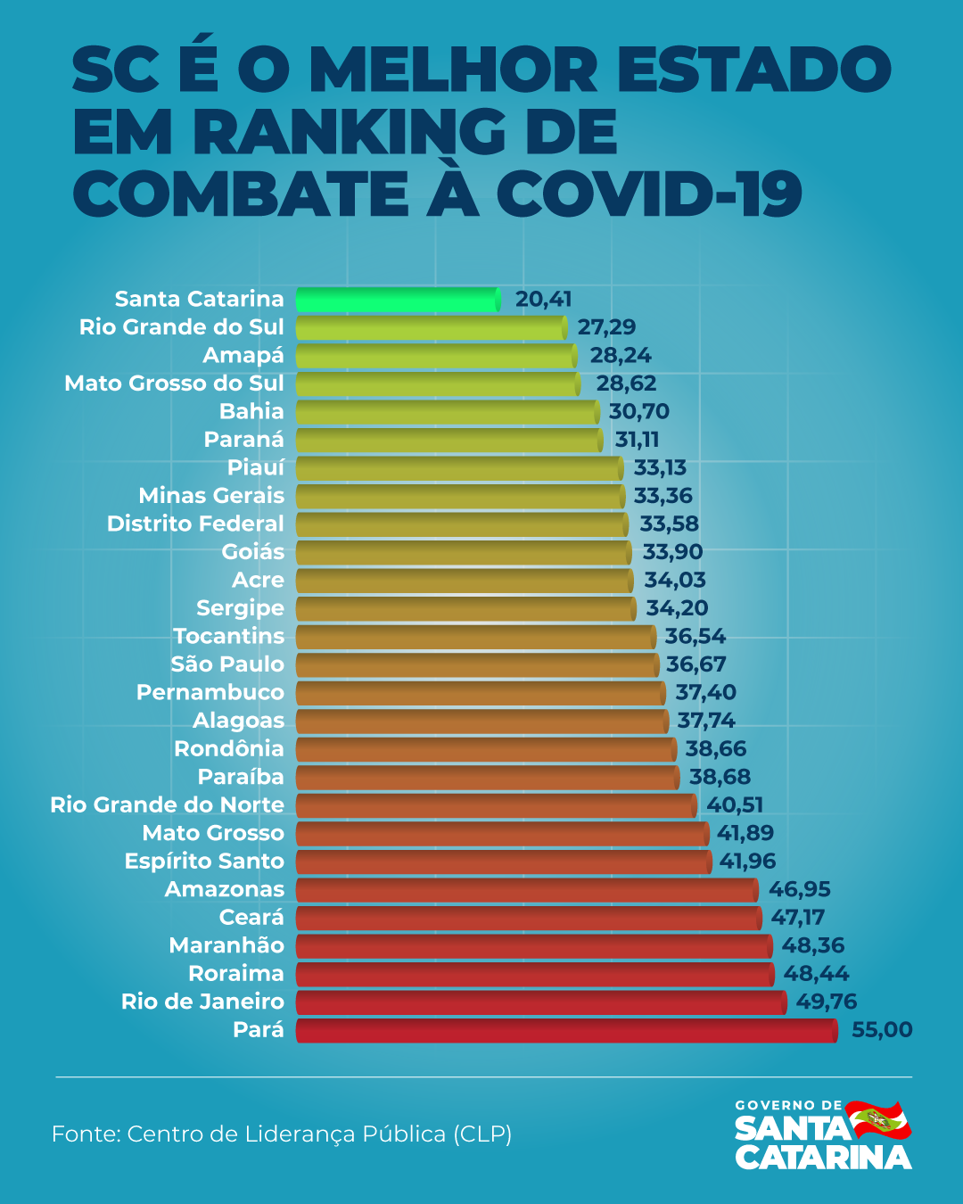 Santa Catarina tem o melhor desempenho do Brasil no enfrentamento à pandemia do novo coronavírus. O reconhecimento está no Ranking Covid-19 dos Estados, divulgado na semana passada pelo Centro de Liderança Pública (CLP) em reportagem do Broadcast da Agência Estado. SC avançou uma posição em relação à semana anterior, quando estava na vice-liderança.