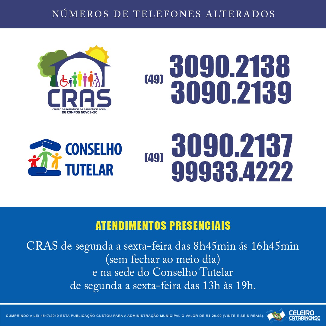 A Prefeitura Municipal por meio da Secretaria de Assistência Social, informa que os números de telefone do Centro de Referência de Assistência Social - CRAS e do Conselho Tutelar do Município foram alterados.