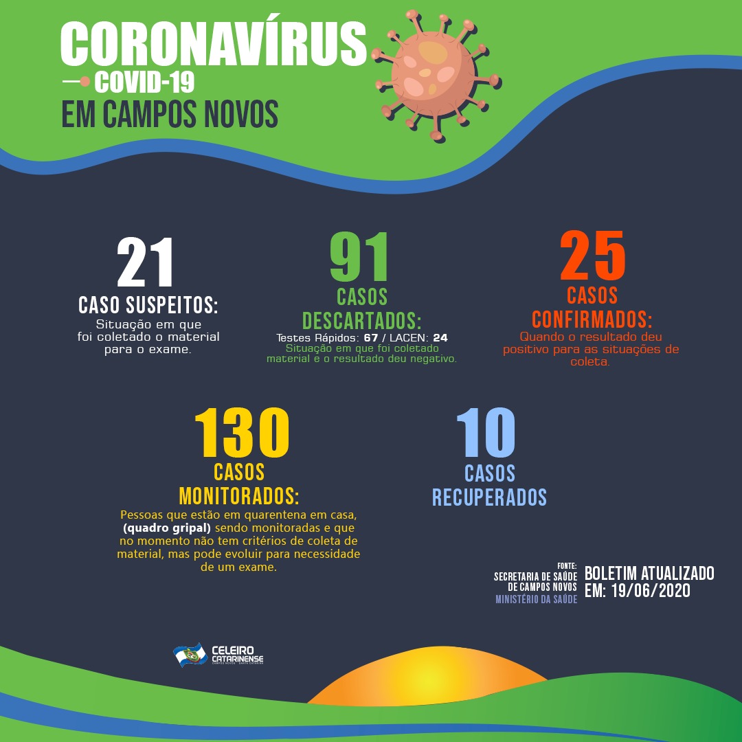 Diante dos novos casos, até na tarde desta sexta-feira, 19/06, Campos Novos possui 21 casos suspeitos; 130 monitorados; 91 descartados (67 testes rápido e 24 via PCR); além de 25 pacientes confirmados, sendo que 10 deles são considerados recuperados.