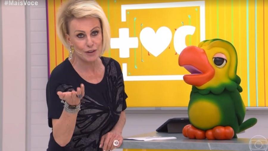A apresentadora explicou que a couve era tradicional no Rio de Janeiro, enquanto o papagaio concordava e ria ao lado da apresentadora.