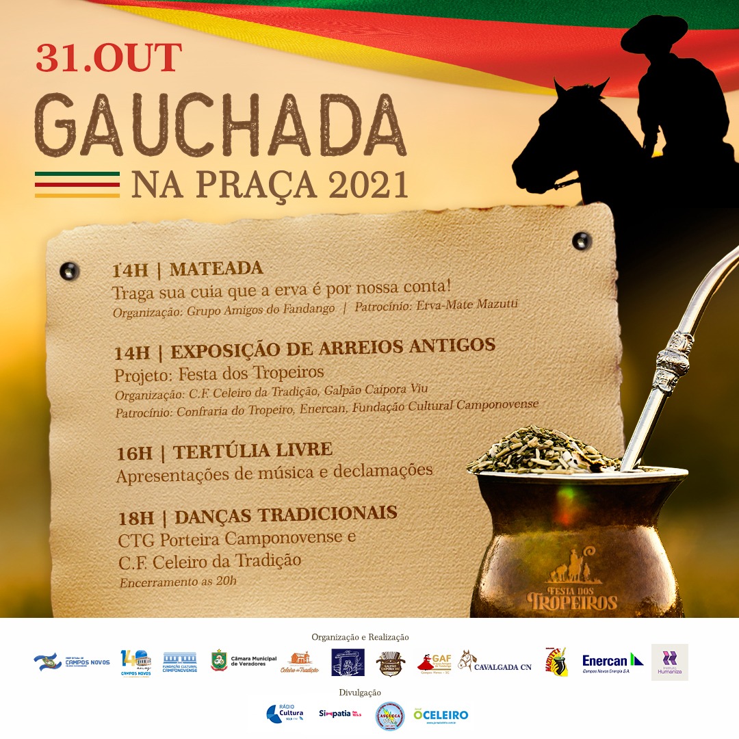 Neste domingo (31) acontece em Campos Novos o Gauchada na Praça. O evento alusivo à Semana Farroupilha teve a data transferida por conta da previsão de chuva.