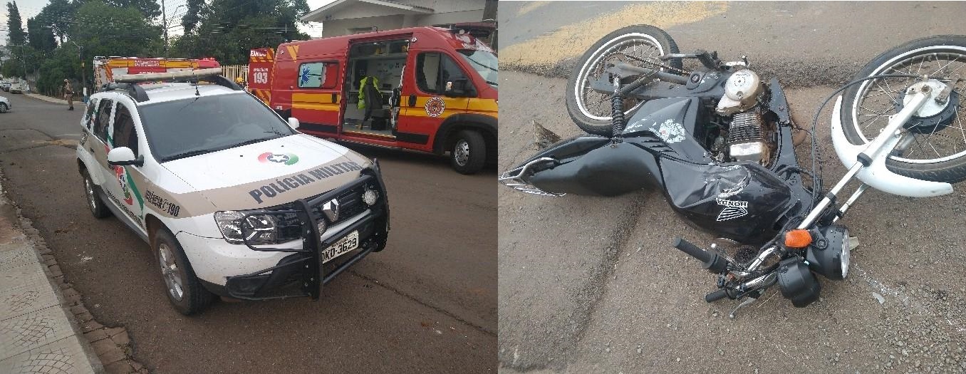 Às 17h30min de sábado (30), uma guarnição fazia patrulhamento de rotina, quando na Praça Lauro Muller, centro de Campos Novos avistou uma motocicleta sem retrovisores, fazendo manobras perigosas num local de grande movimentação de pedestres. Ao tentar abordar a moto, o condutor empreendeu fuga na contramão de direção pela Rua: São João Batista, colocando em risco a vida de transeuntes e passando por outras ruas na contramão. A viatura efetuou acompanhamento, por outras ruas na mão correta e quando chegou na Rua: XV de Novembro a moto transitava em sentido contrário na contramão efetuado ultrapassagem de outros veículos e colidiu de frente na viatura, vindo o condutor a cair e sofrer ferimentos.