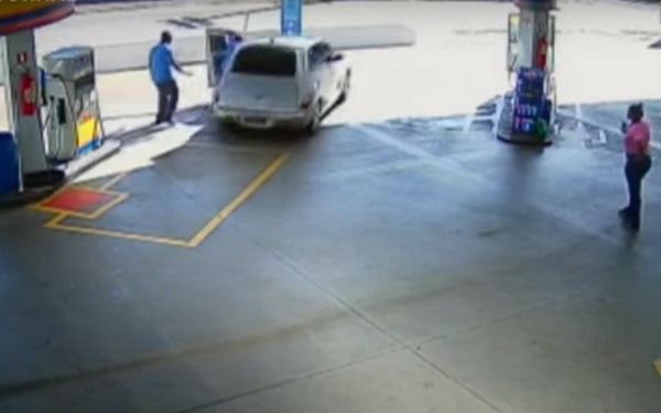 Pelas imagens é possível ver o motorista acelerando com a porta aberta, após discutir com os frentistas do posto. Os trabalhadores relataram que foram ameaçados pelo motorista que se recusou a pagar a conta de R$ 50 pelo serviço.