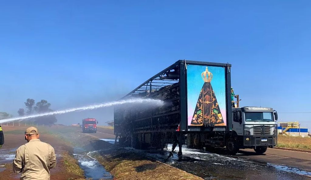 Uma carreta carregada com fardos de algodão pegou fogo, na manhã desta quinta-feira (28), na Rodovia Federal 267, em Bataguassu (MS). Apesar das chamas terem consumido a parte de carga do veículo, um painel de Nossa Senhora Aparecida, que estava acoplado na carroceria, ficou intacto.