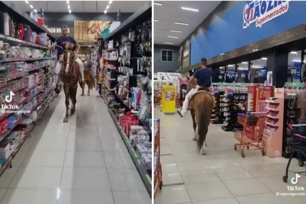 Um vídeo, daqueles que parecem mentira, viralizou nas redes sociais no último final de semana. Um homem montado a cavalo circula pelos corredores de um supermercado.