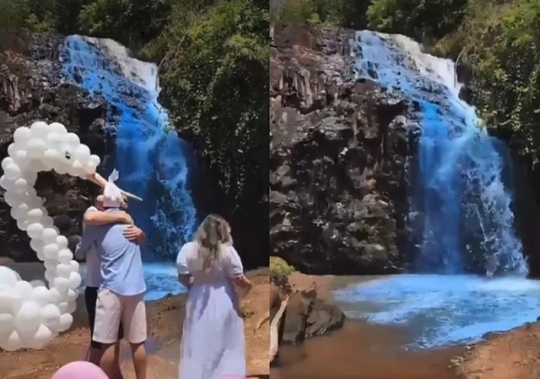 Um casal usou pigmentação azul para tingir a cachoeira do rio Queima-Pé, em Tangará da Serra, interior do Mato Grosso, para revelar o sexo do bebê que esperam. Os dois foram criticados nas redes sociais e acusados por internautas de "crime ambiental".