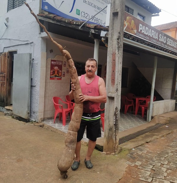 Ele colheu no local uma mandioca de 2 metros e 40 centímetros, com peso de aproximadamente 30 quilos.