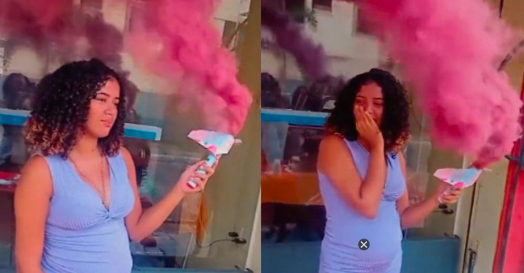 A mamãe estava com um vestido azul, e, para anunciar o sexo do bebê, ela usou uma espécie de jato de fumaça colorida, que saiu rosa. Os internautas chegaram a comentar que, em certo momento do vídeo, ela até pareceu segurar o choro.