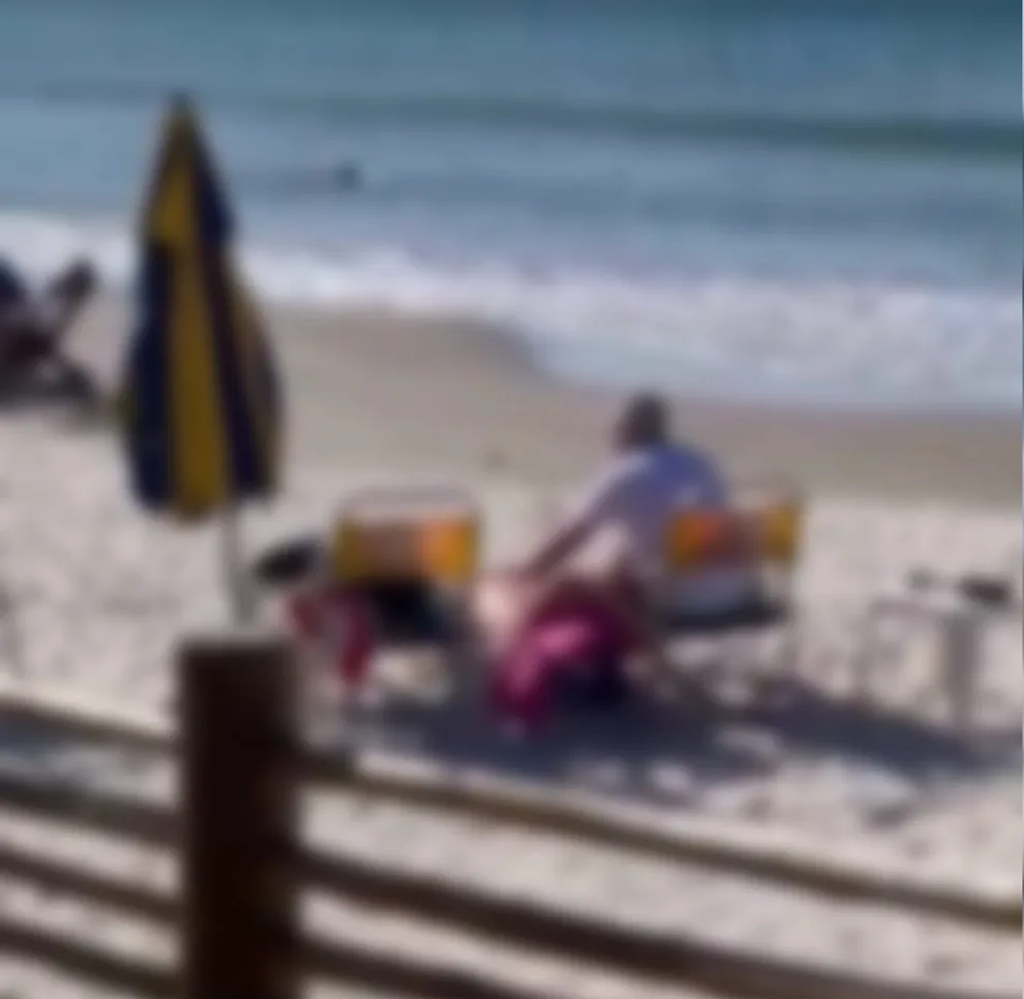 Nas imagens é possível ver que o homem e a mulher estão sentados em uma cadeira, quando o ele começa a passar a mão pelo corpo dela. Perto deles, há outras pessoas sentadas na faixa de areia. Enquanto os dois se beijam, uma criança também passa pelo local. Havia atos sexuais no comportamento.