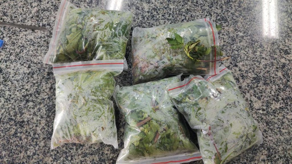 Durante a busca pessoal, foram localizados cinco pacotes contendo plantas de maconha, pesando aproximadamente 315 gramas. Além disso, foi localizada a faca que ele utilizou para ameaçar os pedestres.