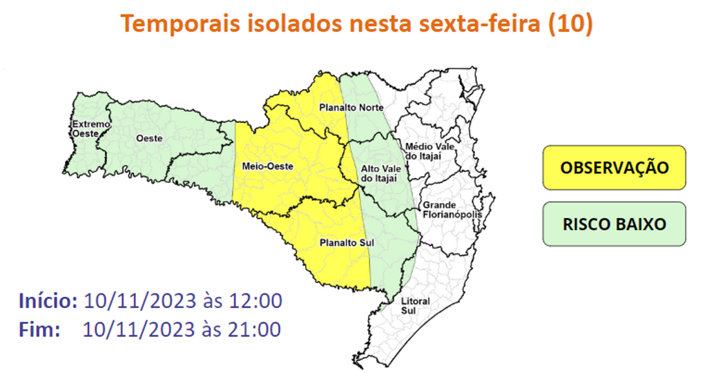 Com exceção do Litoral, o restante do Estado tem condições de instabilidade com temporais na tarde e noite desta sexta-feira. A influência de uma área de baixa pressão entre a Argentina e oeste do Uruguai, RS e SC, associado a disponibilidade de calor e umidade, favorece entre a tarde e o início de noite, a formação de pancadas de chuva e temporais isolados em áreas do Grande Oeste, Planalto Sul e em partes do Planalto Norte e Alto Vale do Itajaí.