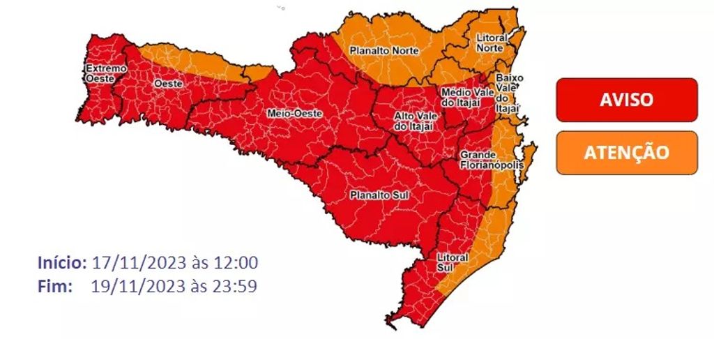 Municípios de pelo menos nove regiões do Estado (parte vermelha do mapa) estão com risco muito alto, como: Extremo Oeste; parte do Oeste e Meio-Oeste; Planalto Sul; quase todo Alto Vale do Itajaí; e parte do Litoral Sul, Grande Florianópolis, Médio Vale do Itajaí e Planalto Norte