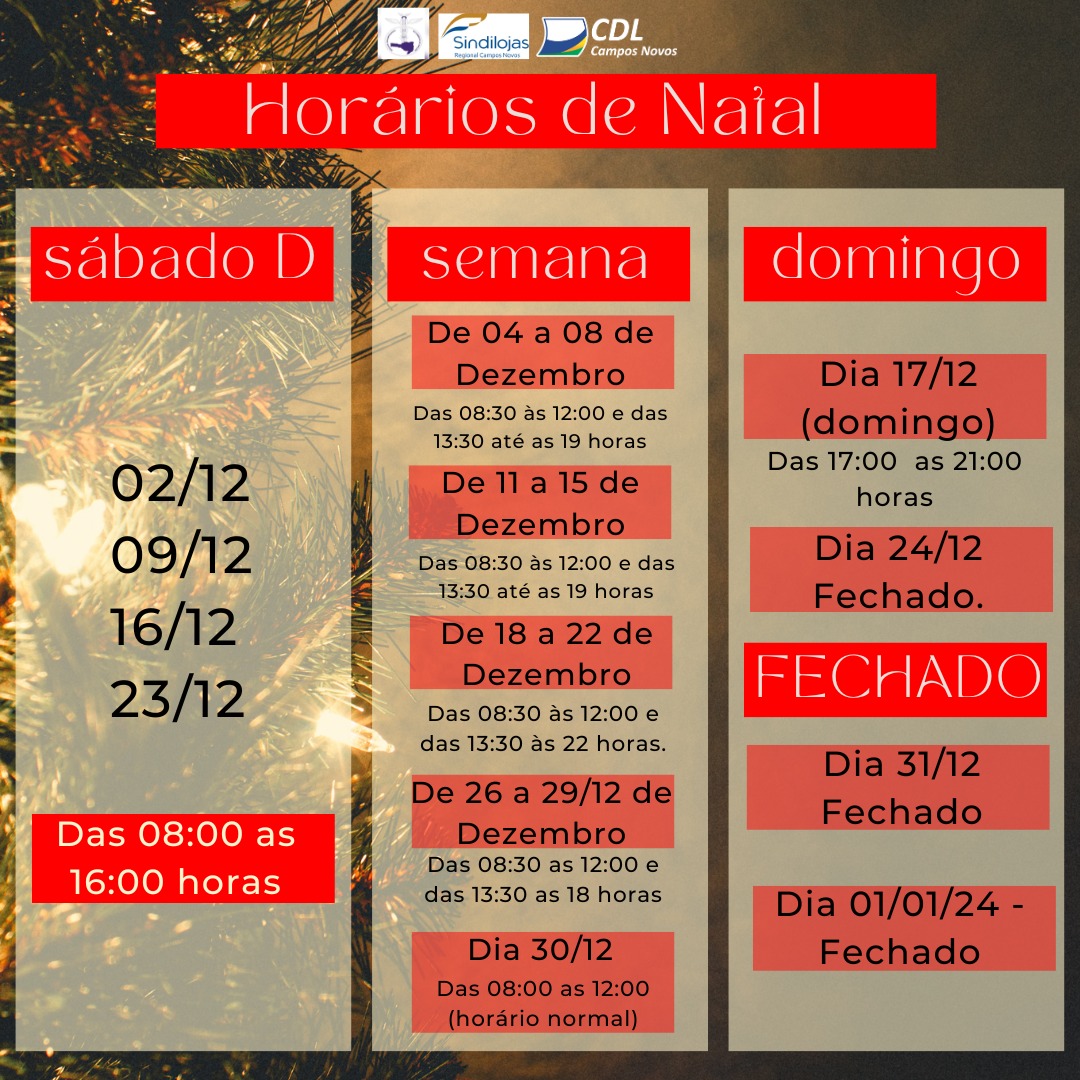 comercio estará será fechado. No dia 17 dezembro o comercio fará horário