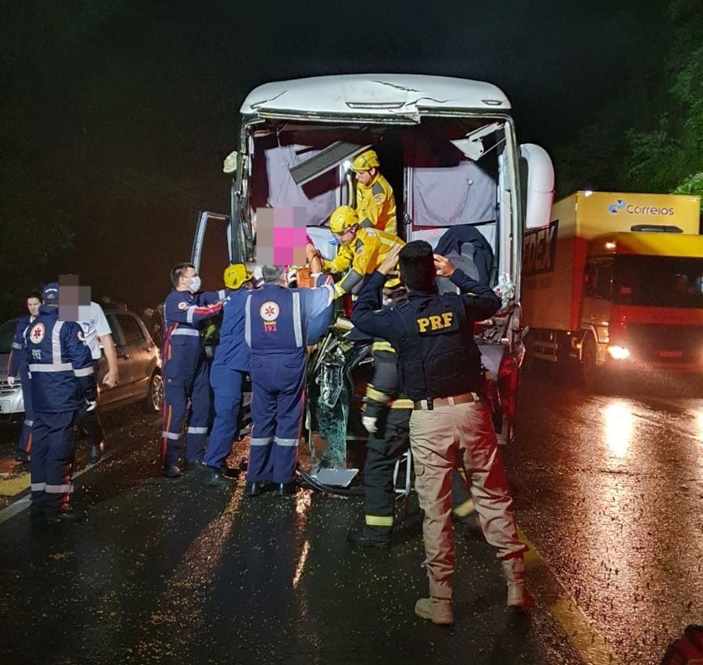 Os demais ocupantes saíram por meios próprios de dentro do veículo. Foram conduzidos por veículo próprio da empresa responsável pelo ônibus. Não há informações em relação ao caminhão. A Polícia Rodoviária Federal (PRF) também foi acionada para realizar levantamentos e orientações. As causas do acidente também não foram informadas.
