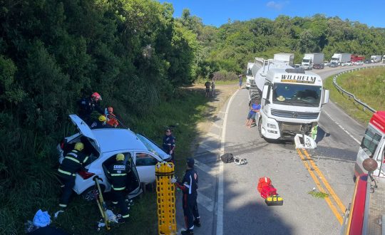 Rancho Queimado – Um acidente envolvendo um carro e um caminhão de transporte de ração animal ocorreu na manhã desta terça-feira (30), por volta das 08h26, na BR-282 em Rancho Queimado, na Grande Florianópolis. O acidente resultou na morte de uma mulher que estava no carro, enquanto um homem ficou preso às ferragens.