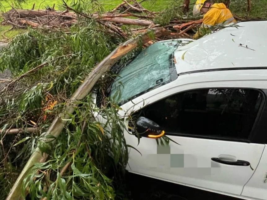 O veículo de uma empresa foi atingido por eucaliptos que caíram com a força do vento durante o temporal na tarde desta quarta-feira (7) no Distrito de Linha Santa Helena, interior de Joaçaba.