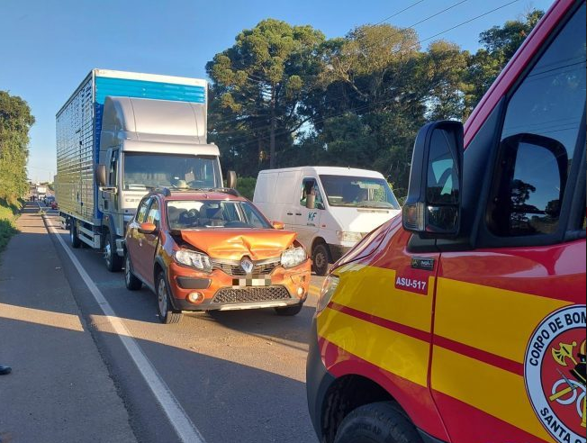 No local, constatou-se uma colisão frontal – traseira, envolvendo três veículos, sendo um Ford Cargo 1119, conduzido por um homem de 22 anos, que nada sofreu, foi encontrado em pé, consciente e orientado, recusando atendimento.