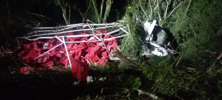No local, a guarnição constatou que tratava-se de um veículo que transportava aves para o abate e caiu em uma ribanceira de aproximadamente sete metros de profundidade. De acordo com os bombeiros, o motorista não estava no local doo acidente e a carga estava parcialmente espalhada pela vegetação e a cabine apresentava poucos danos.