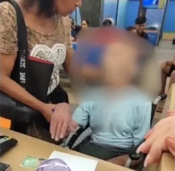 Um vídeo, feito pelas atendentes do banco, mostra que a todo tempo ela tentava manter a cabeça do homem reta, usando a mão e conversava com o suposto parente.