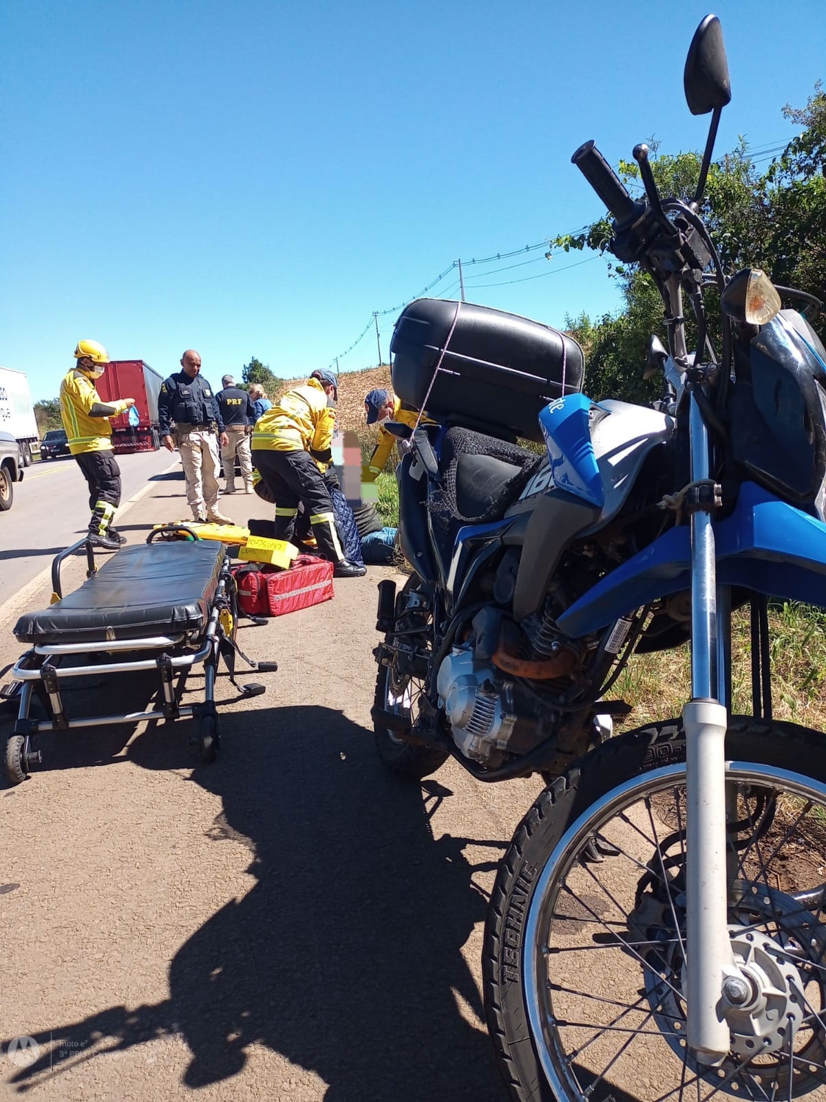 A colisão envolveu uma motocicleta Honda Bros, de cor azul e um veículo Argo, de cor branca.