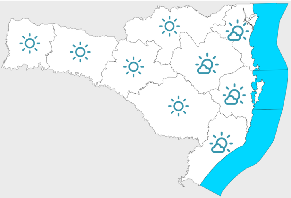No amanhecer as mínimas variam de 8 a 11°C nos planaltos, de 10 a 14°C no Grande Oeste e ficam em torno de 14 a 18°C no litoral. As temperaturas se elevam rapidamente no decorrer do dia e ficam entre 23 e 26°C em praticamente todas as regiões, se aproximando dos 30°C no Oeste catarinense.