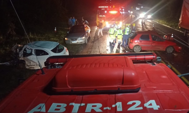 Cinco pessoas adultos morreram e uma criança foi resgatada em estado grave após um acidente que envolveu três veículos no início da noite deste domingo (28) no km 65,2 da BR-116, em Papanduva. A tragédia, registrada por volta das 19h40min na localidade de Floresta, mobilizou Bombeiros de Papanduva, Monte Castelo, Major Vieira e Canoinhas, além de equipes de socorro da Autopista Planalto Sul.