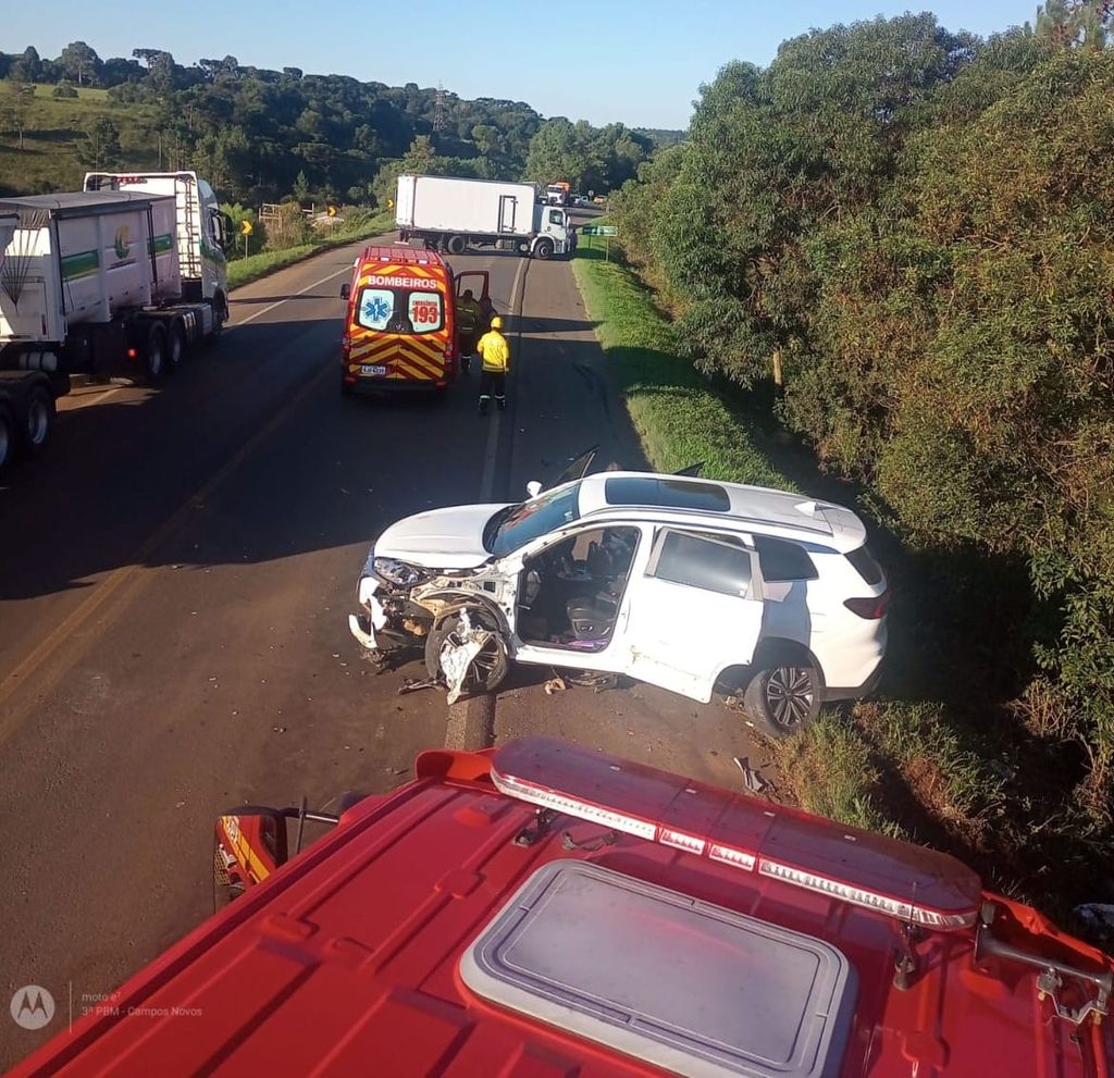 Um acidente de trânsito deixou duas pessoas feridas na tarde desta segunda-feira, dia 06, em Campos Novos, no Meio-Oeste. Foi uma colisão envolvendo um veículo Tiggo 6,uma caminhonete S-10, e um caminhão, todos com placas Mercosul, pouco antes das 16 horas, na BR-282, no bairro Cohab-Boa Vista.