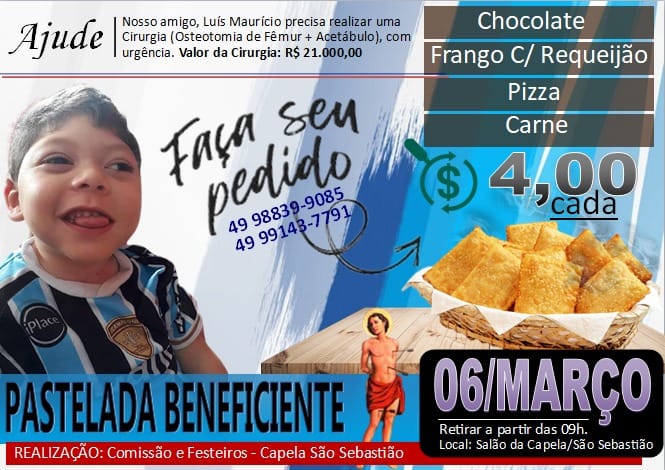 A Comissão de Festeiros da Capela São Sebastião promoverá no dia 06 de março, uma pastelada beneficente para ajudar Luís Maurício, morador do município e que precisa realizar uma cirurgia de Osteotomia de fêmur + Acetábulo e que custa R$21 mil.