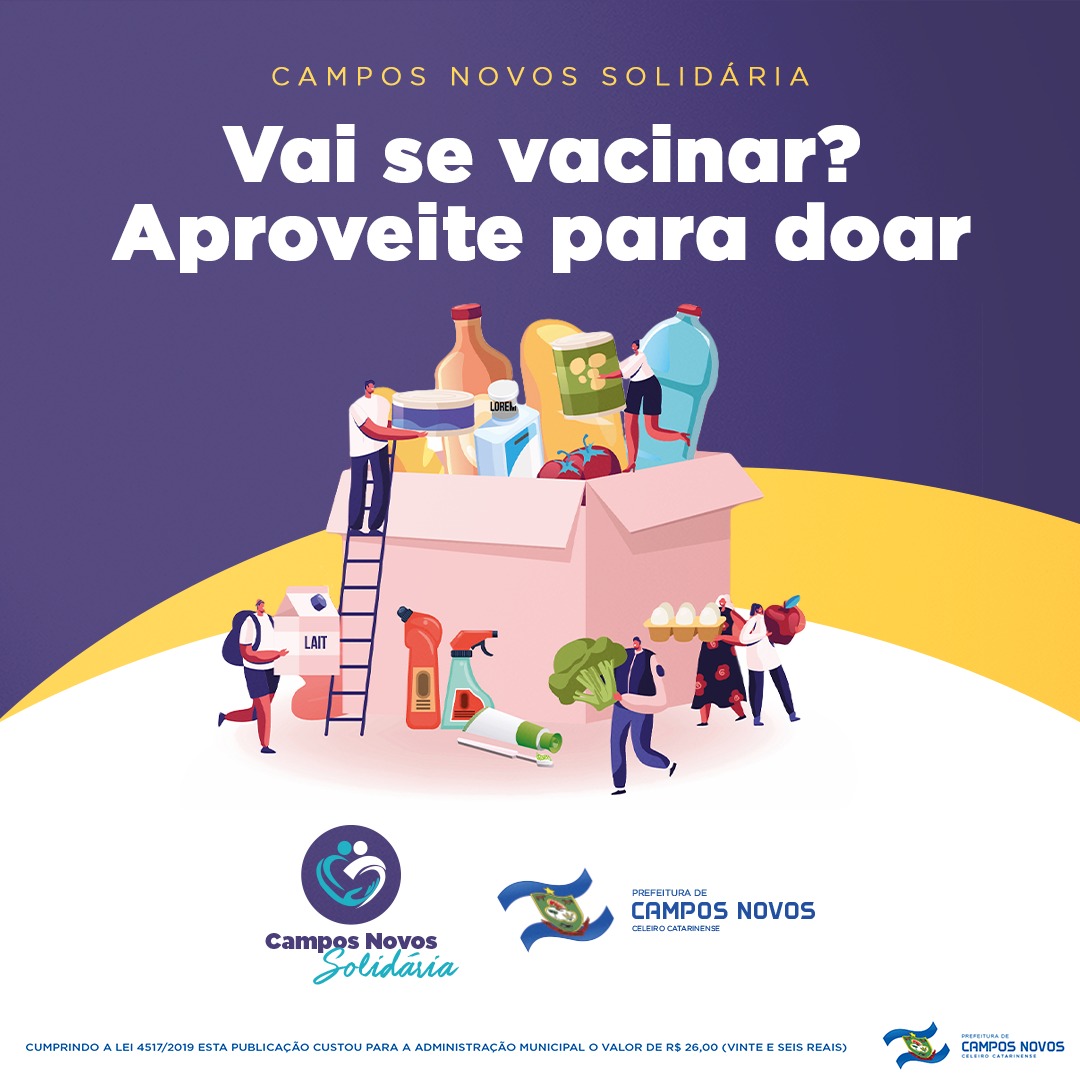 Visando a assistência aos menos favorecidas e das famiílias em situação de maior vulnerabilidade, a Administração Municipal de Campos Novos realiza campanha de arrecadação de alimentos durante vacinação contra covid-19.