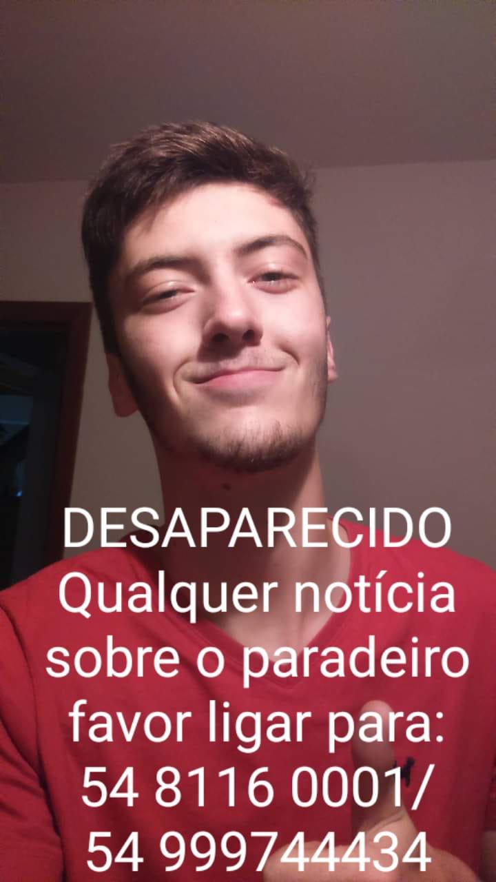 Se alguém o ver favor informar os familiares no QSO 54.999744434 Rodrigo Colett (Pai) ou no 54.98116001 Sheila Centenaro (mãe).
