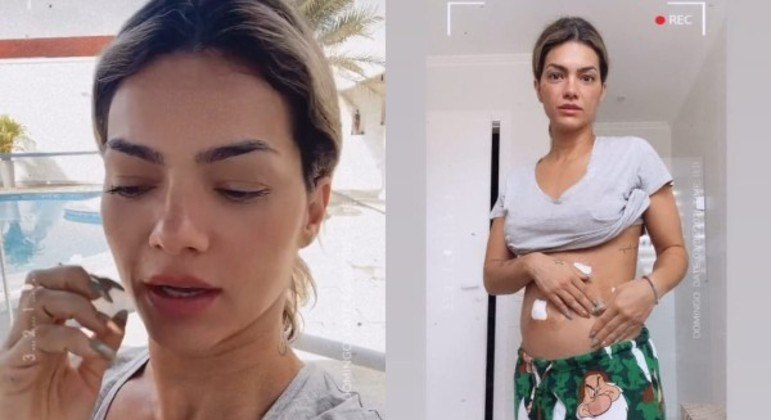 "Olha o tamanho. Podia ser um neném. Engraçado que as minhas estrias, agora, estão bem evidentes. Quase não se via. Estou sem enjoo e me alimentando normal. Comi arroz integral com frango cozido. Quando a gente faz essa cirurgia não pode comer alimento cru durante pelo menos dez dias. Nem estou me medicando", disse.
