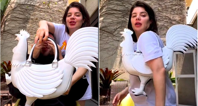 Depois de chamar atenção ao aparecer com uma bolsa em formato de pombo, Gkay surpreendeu os fãs mais uma vez. A influenciadora, agora, comprou um acessório com um formato de um galo.
