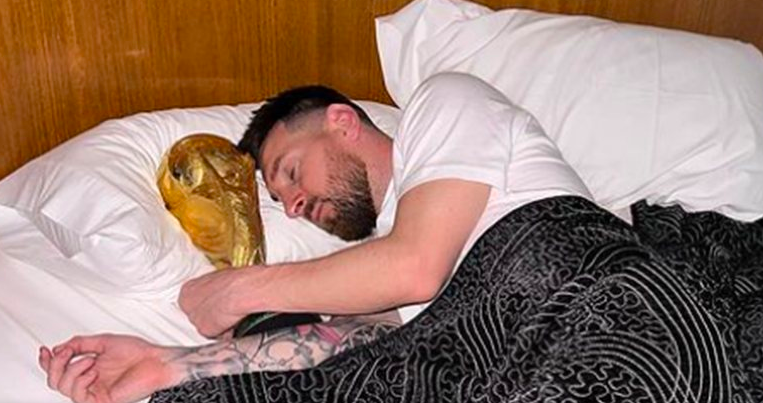 O jogador de futebol Lionel Messi (35) está se divertindo com a taça da Copa do Mundo do Catar. Após a vitoria da Argentina no mundial, ele já tirou várias fotos com o troféu e a mais recente delas é bem divertida. Dessa vez, o atleta apareceu dormindo abraçado com a taça!