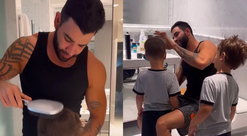 "Ainda bem que o pai chegou para fazer esse topete, porque a mãe leva zero jeito para isso", contou Andressa. Na sequência, Gusttavo ainda apareceu penteando os cabelos de Gabriel. "O meu topete é maior que o do papai", disse Samuel.