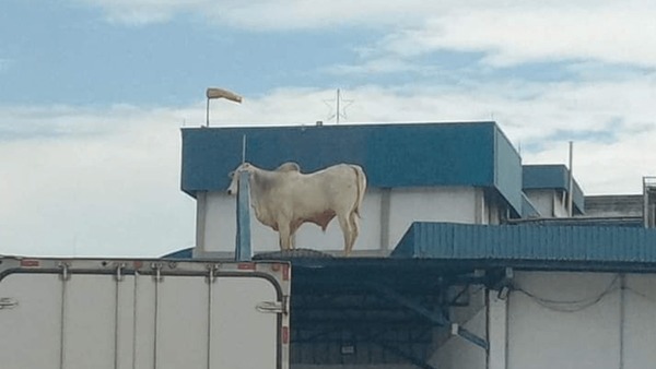 Nas imagens inusitadas, o bovino aparece andando de um lado para o outro, em cima do telhado de um galpão, enquanto funcionários da empresa observam a cena.
