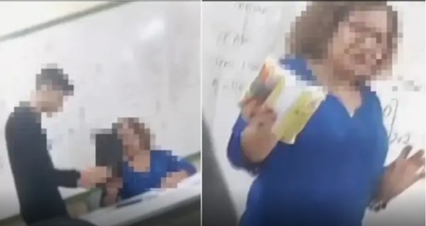 Nas imagens, é possível ouvir uma aluna alertando a professora de português para não aceitar o objeto. Quando a professora abre o embrulho, encontra uma esponja de aço e fica visivelmente constrangida, enquanto outros estudantes dão gargalhadas. Ela diz: “Vou aceitar, porque tudo o que vem volta".