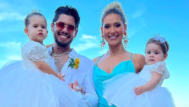 Para a ocasião, a influenciadora apostou em um elegante vestido acetinado na cor azul bebê, realçando ainda mais sua beleza. Enquanto isso, suas filhas roubaram a cena com vestidos brancos de daminhas de honra, irradiando fofura. Já Zé Felipe optou pelo clássico terno branco, combinado com uma camisa aberta e uma flor amarela no bolso, mostrando seu estilo único e sofisticado.