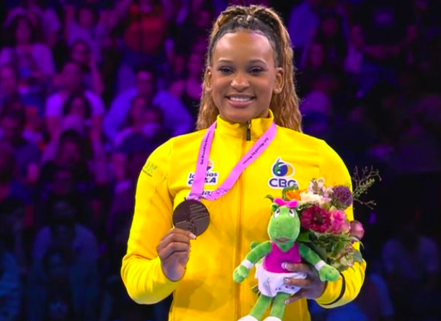 Rebeca Andrade travou mais uma disputa emocionante com Simone Biles neste sábado (07/10) e, desta vez, conquistou medalha de ouro no Mundial de Ginástica Artística da Antuérpia, na Bélgica. A americana foi a primeira a saltar e estabeleceu média de 14,549 e só foi superada após dois saltos impecáveis da brasileira, que atingiu média de 14,750 para confirmar o seu bicampeonato do salto.