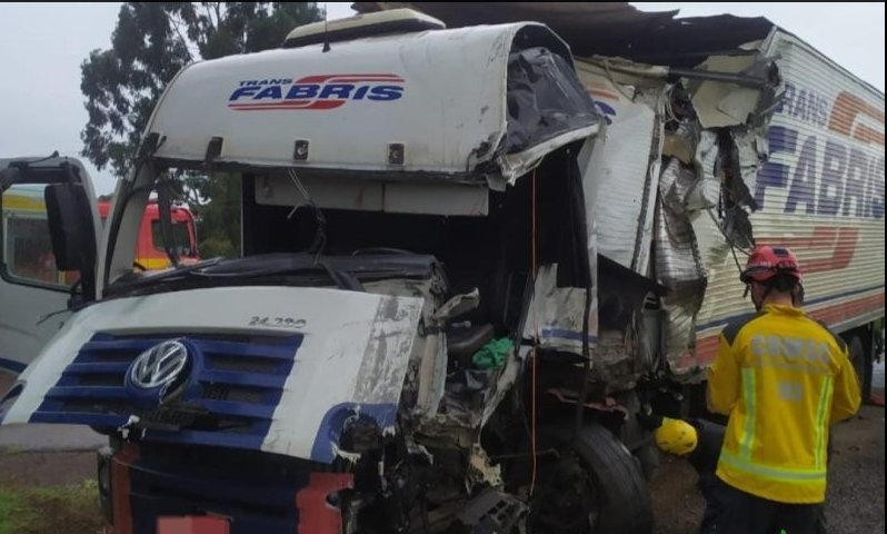 Ao chegar no local, os Bombeiros confirmaram a natureza da ocorrência, constatando uma colisão frontal entre dois caminhões.